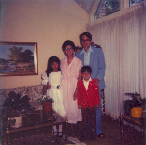 [Photo of my family on the day of my First Communion, circa 1981. I’m pouting and my brother is giving one of our houseplants the side-eye. I would totally wear my mom’s dress in this day and age, and my dad is looking pretty Studio 54. They both look young and amazing, not a gray hair in sight.]